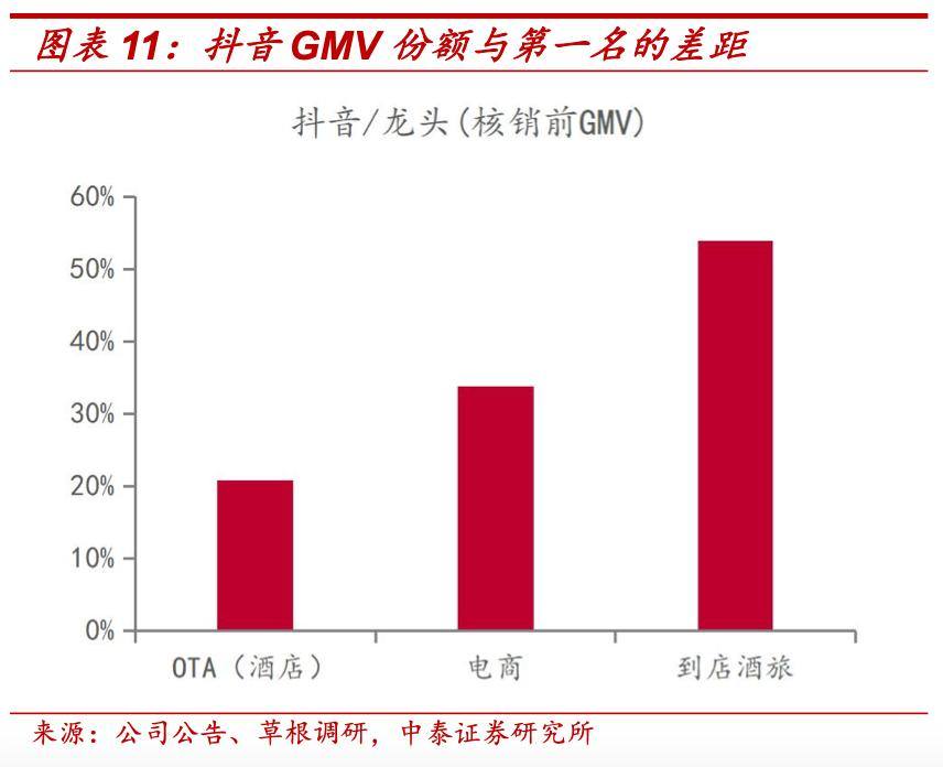 据中泰证券估算,抖音在 OTA 行业的市场份额上升较为缓慢,预计核销前 GMV 仅为携程 20%左右,远低于在电商、到店领域的份额。进一步考虑显著偏低的抖音酒店核销率,实际份额差距更大。