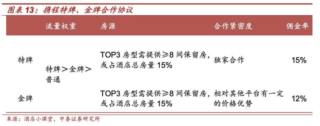 据中泰证券披露,携程目前合作的酒店大概分为三种,分别是独家合作的特牌、保障携程平台更低价的金牌,以及普通合作模式,其中,特牌和金牌的佣金率分别为15%、12%。