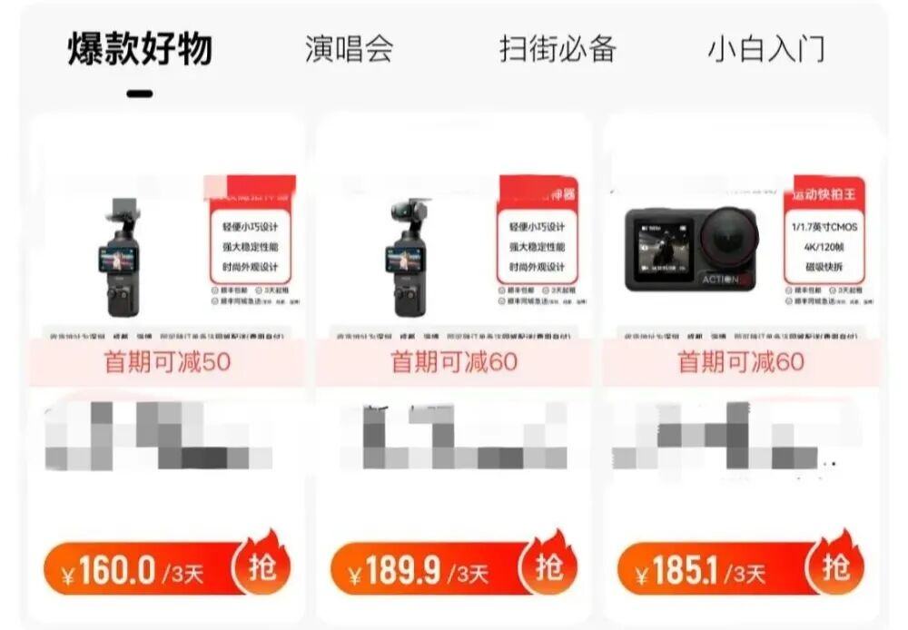 除了运动相机之外,这家相机租赁店铺也挂出了传统的单反相机、AI眼镜和自带长焦拍摄的“演唱会神器”,几款热门产品的订单数在几十到一百多不等,而运动相机是店铺中最受欢迎的产品,最畅销的一款运动相机,“已售”显示三百多次。