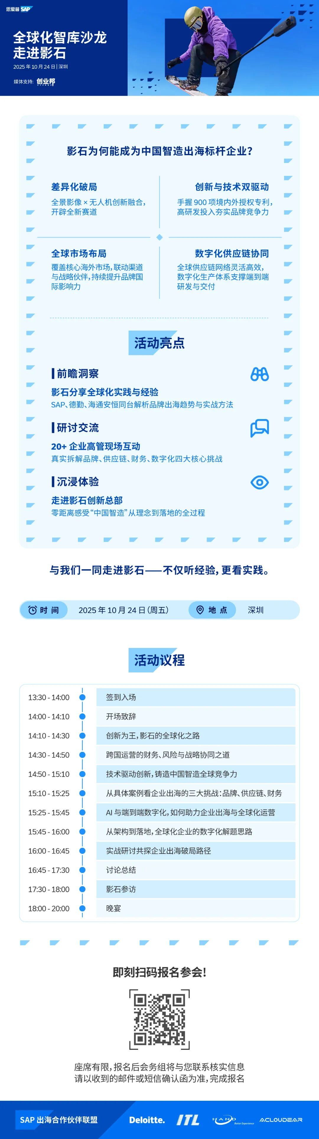 为进一步解析这本“出海教科书”的实战密码,创业邦联合SAP特别策划「全球化智库沙龙」,将于10月24日走进影石。活动现场,影石团队将分享他们在品牌全球化、供应链韧性建设、海外财税合规等方面的实践经验;来自SAP的专家也将带来关于数字化转型与出海战略的前沿洞察。