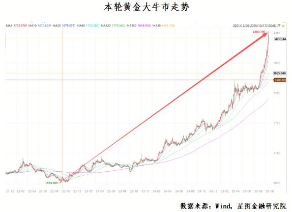 本轮黄金大牛市始于2022年,伦敦现货黄金自1614美元/盎司开启上行,目前最高达到4380.79美元/盎司,期间累计涨幅达171.42%,但仍远低于前两轮大牛市的峰值水平。尽管近期黄金有所回调,但整体上行趋势仍未改变,考虑到当前上涨动能尚未衰竭,预计未来仍有进一步上行空间。