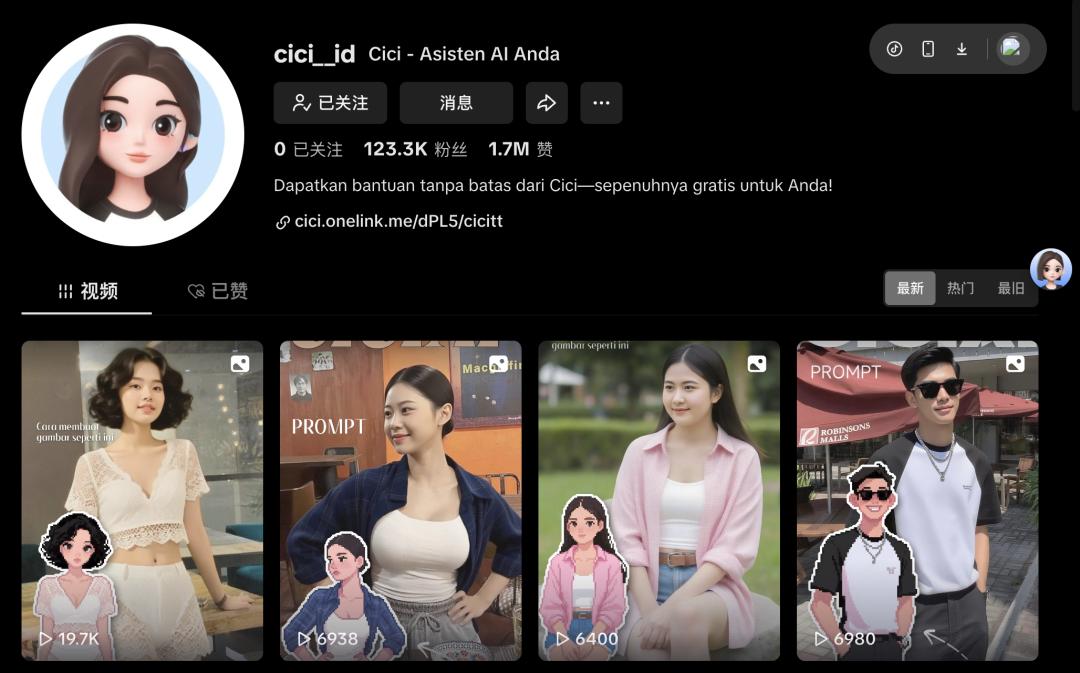 在 tiktok 上,Cici 的官方账号已有大约 12.3 万粉丝|图片来源:极客公园