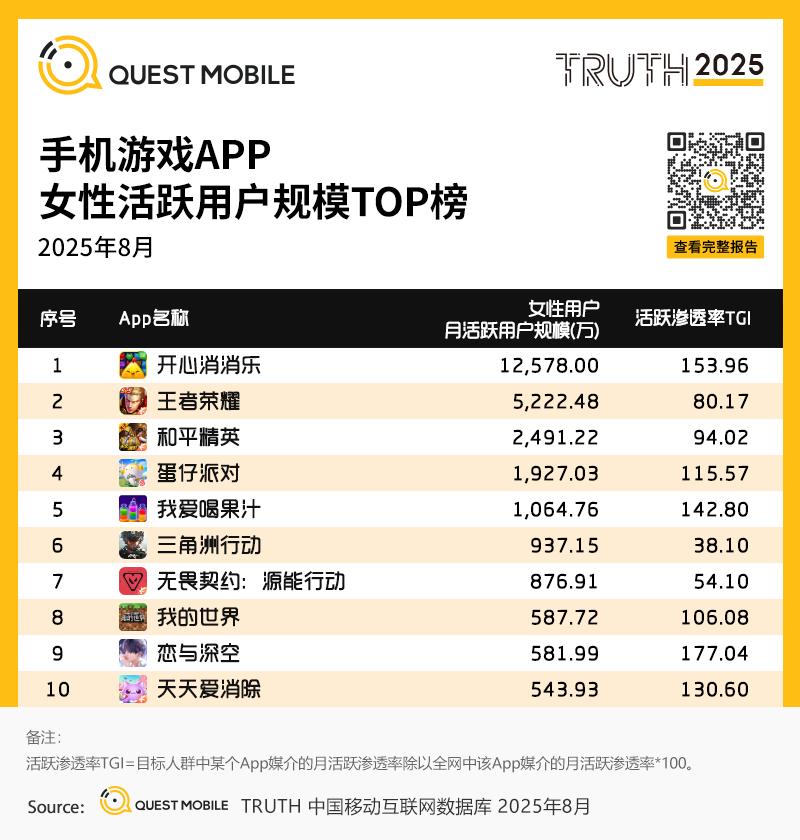 QuestMobile数据显示,《开心消消乐》凭借强社交与轻度休闲属性吸引超七成女性用户,《恋与深空》以情感共鸣和IP运营吸引用户,活跃率达64.8%,远超行业平均水平,在增强女性游戏玩家的粘性和长期留存方面表现卓越。