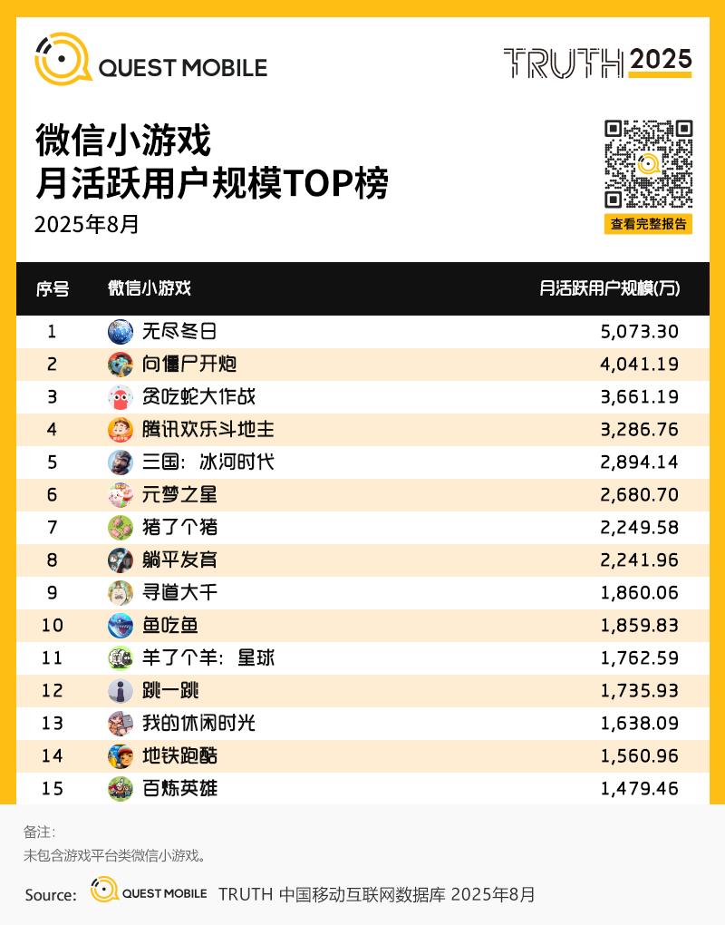 手机游戏APP专注于深度沉浸体验,满足用户长时间高质量娱乐需求,QuestMobile 2025年8月数据显示,手机游戏APP行业人均单日使用次数和时长分别达到23次和114.4分钟;微信小游戏则以轻量化、碎片化特点,提供便捷快速的游戏体验,两者互为补充,满足了用户在不同场景下的多样化需求。