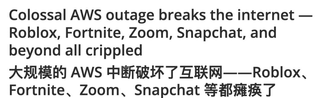 AWS 为全球主流科技生态提供支撑——从 Netflix 的流媒体分发、Tesla 的数据湖分析、再到 Meta 的AI 训练任务。如此集中化的基础设施宕机,意味着一次“数字基础设施的地震”。