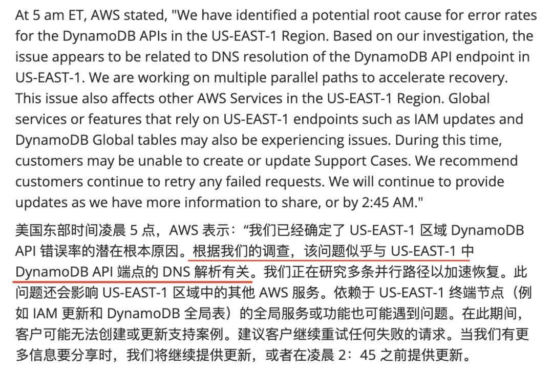 美国东部时间 10 月 20 日 凌晨 3:10 (ET),全球最大云计算服务商之一——Amazon Web Services(AWS,隶属于亚马逊)在其最关键的数据中心区域——美国东部一区(US-EAST-1,北弗吉尼亚)突发严重服务故障。