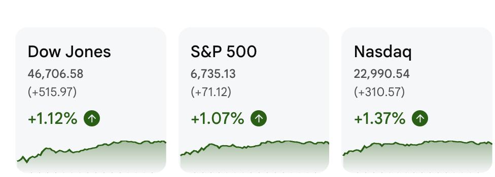 截至收盘,道指收1.12%,纳指涨幅1.37%,标普500涨幅1.07%。
