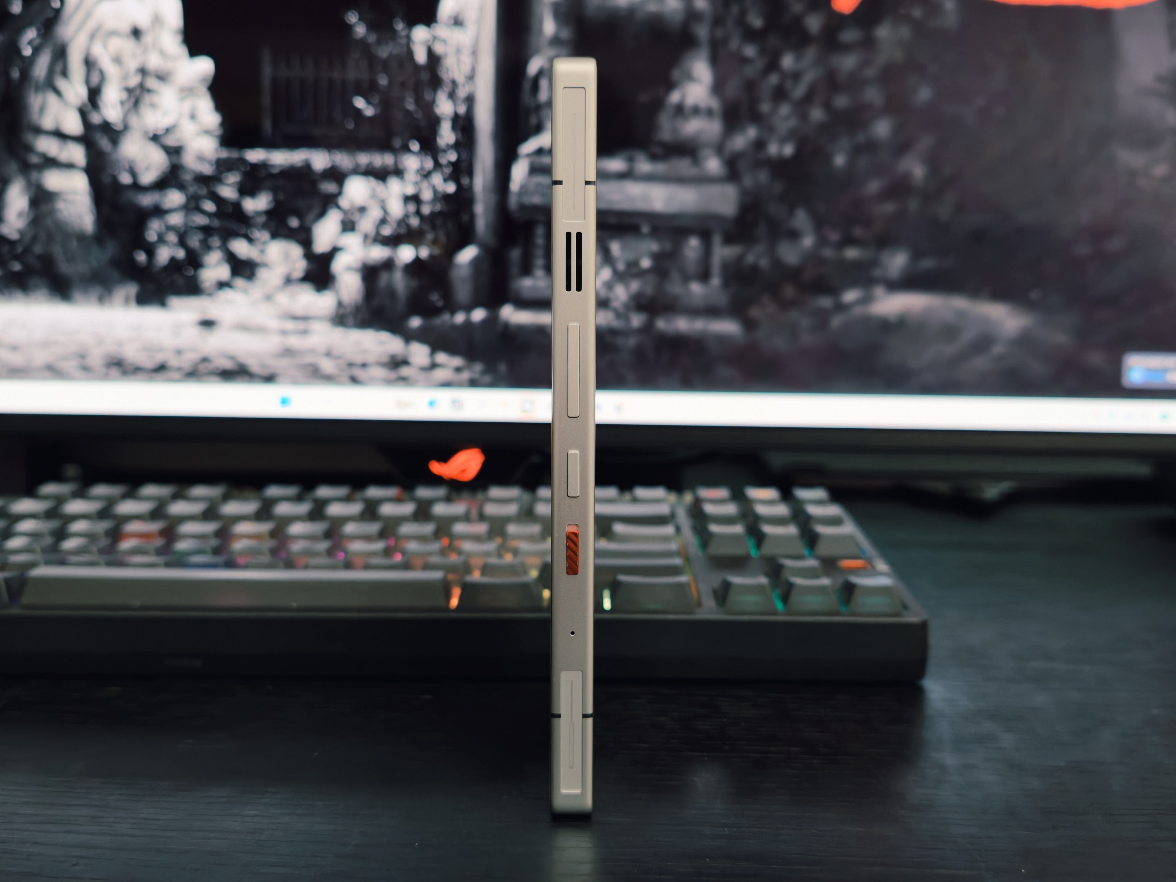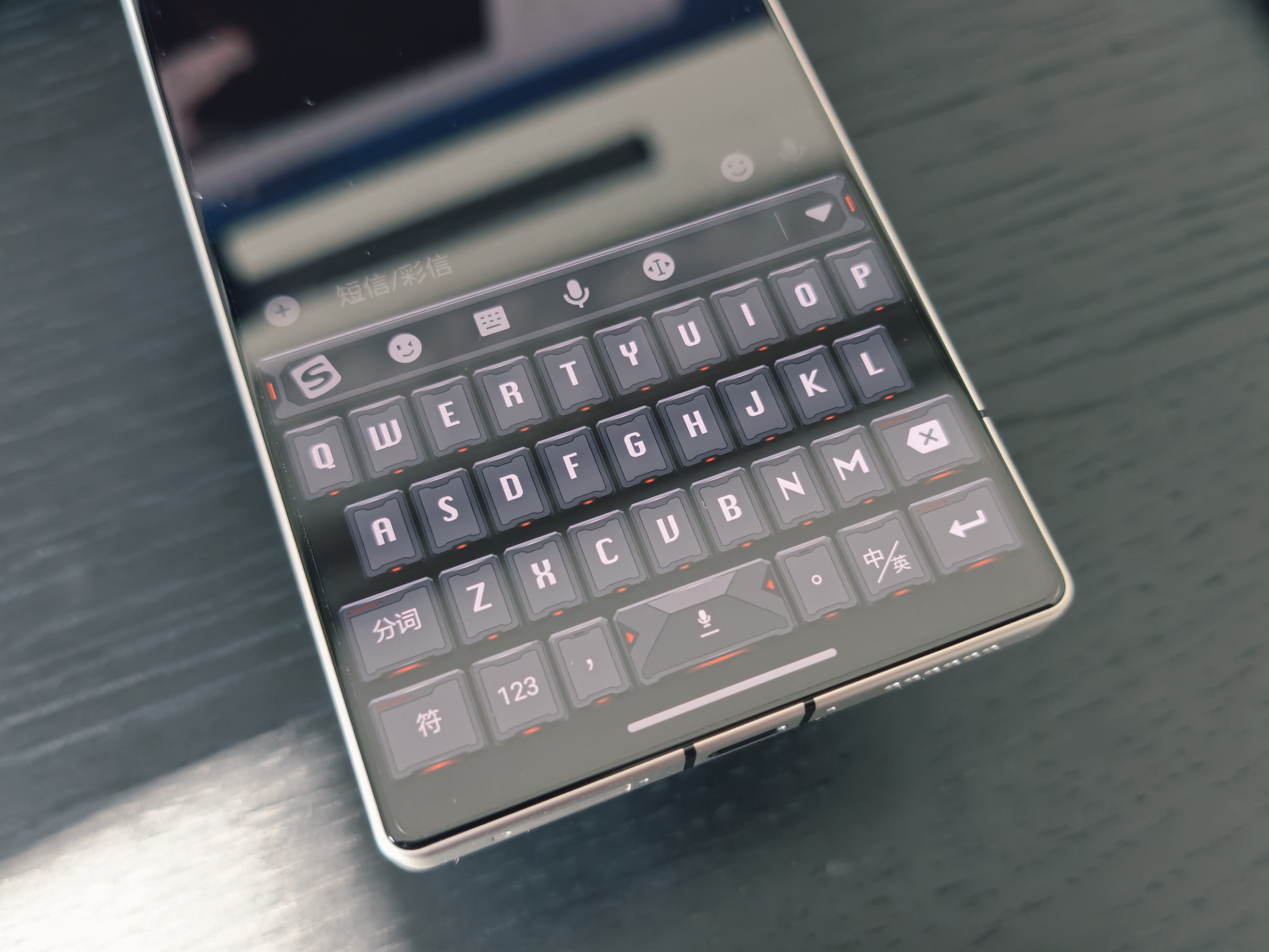 系统级机甲风设计贯穿全程:与搜狗联合定制的 “红魔机甲输入法”,按键采用机甲咬合式纹理,输入时伴随机械齿轮转动音效,符号栏以武器弹药为灵感设计;机身右侧新增 “机甲触发键”,短按启动游戏模式,长按切换 “狂暴性能档”,按键反馈清脆如机甲开关,配合 RGB 灯效同步闪烁,瞬间拉满战斗仪式感。此外,游戏内悬浮窗、技能冷却提示均采用机甲仪表盘样式,连通知弹窗都设计成 “战报提示” 风格,让玩家全程沉浸在机甲作战场景中。