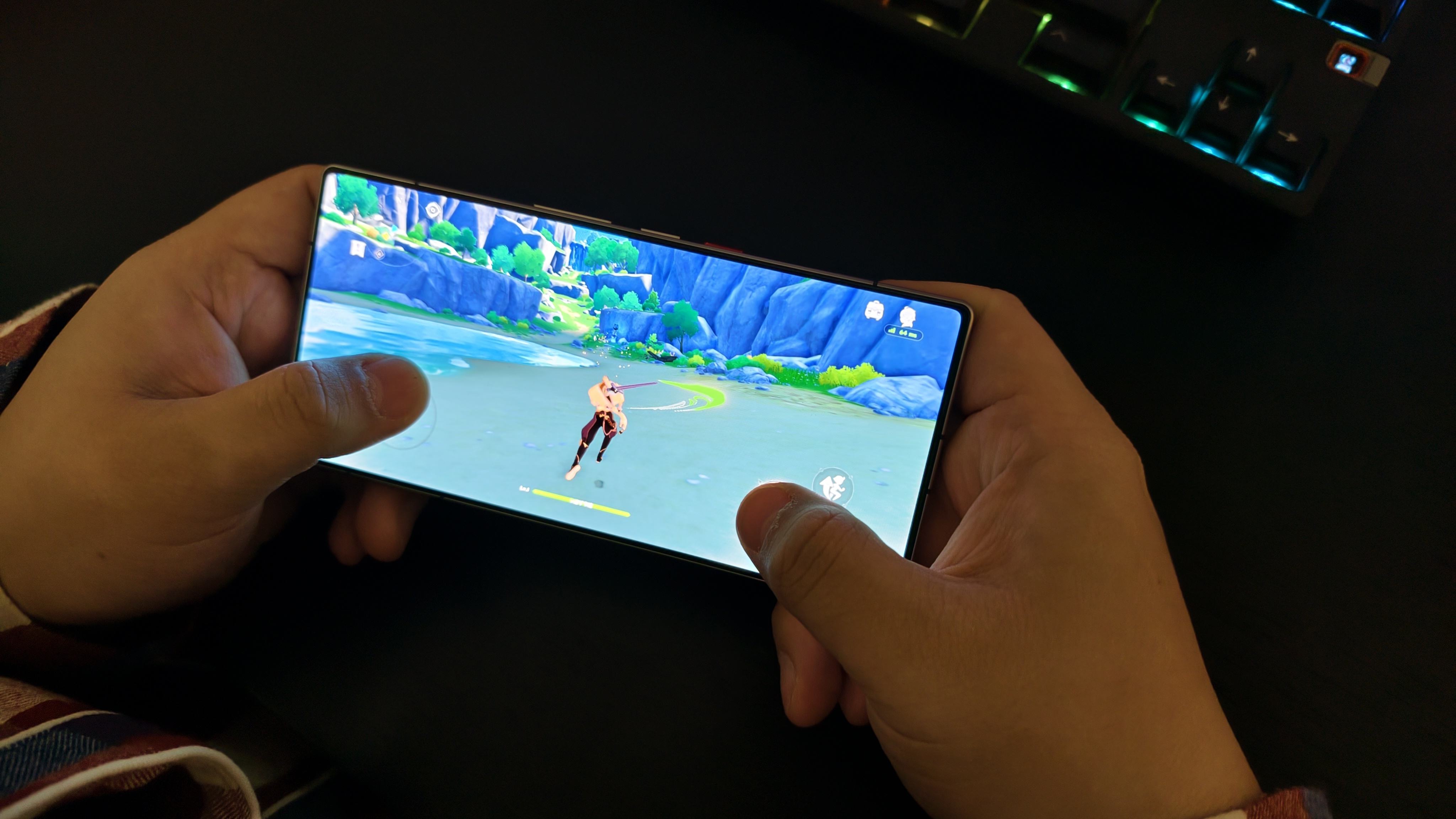 驭风 4.0 风扇以 24000 转 / 分钟高速运转,配合水冷可视化系统与液态金属导热,形成四重散热闭环。两小时《原神》后机身温度仅 40.5℃,《三角洲》120 帧模式下 1 小时温度 41.2℃,均无任何降频现象,IPX8 级防水更让风扇无惧泼溅。