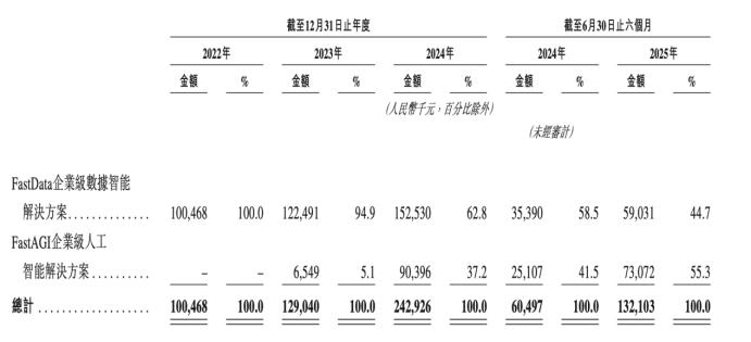 更值得注意的是其业务结构的变化。分产品线来看,FastAGI企业级人工智能解决方案在2023年推出后收入急剧增长,从2023年的655万元增长至2024年的0.9亿元,截至2025年上半年,该业务的营收为0.73亿元,同比增长192%,明显高于FastData企业级数据智能解决方案同期68.57%的营收增速。这也推动FastAGI企业级人工智能解决方案在滴普科技营收总额的占比从2023年的5.1%提升至2025上半年的55.3%,成为公司新的增长曲线。