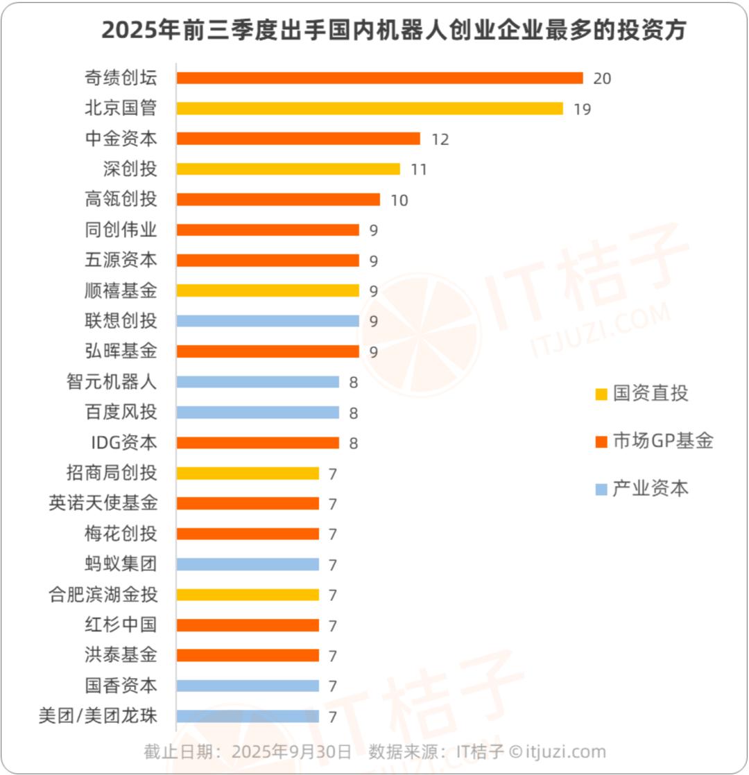 据IT桔子统计,按照出手次数统计,2025年前三季度,活跃在机器人赛道的投资机构TOP20中,有5名属于国资背景,包括北京国有资本运营管理有限公司(简称“北京国管”)及其市场化运作的创投基金“顺禧基金”,深创投、招商局创投,以及合肥滨湖金投。其中,北京国管和深创投出手次数最多,分别达到了19次、11次。