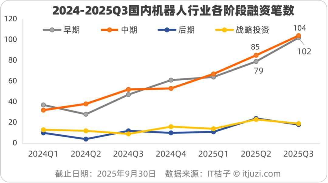 从投资阶段来看,从2025Q1开始,连续三个季度以来,早期投资(Pre-A轮之前)和中期投资(A轮至B+轮)的增长幅度突出。两者数量相当,合计占比已经达到了80%以上,占据了主要的融资地位。