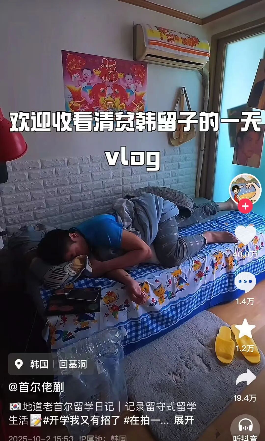 其他最近火起来的“留子”博主,像奉行“能省则省”的李宝善,为讨要生活费要跟家长掰扯一个小时,首尔老蒯的主页写着“免费治疗首尔病”,把在首尔的出租屋装饰城东北农村小房,日常就是发呆,养花(还是假花)和去公园撞树……