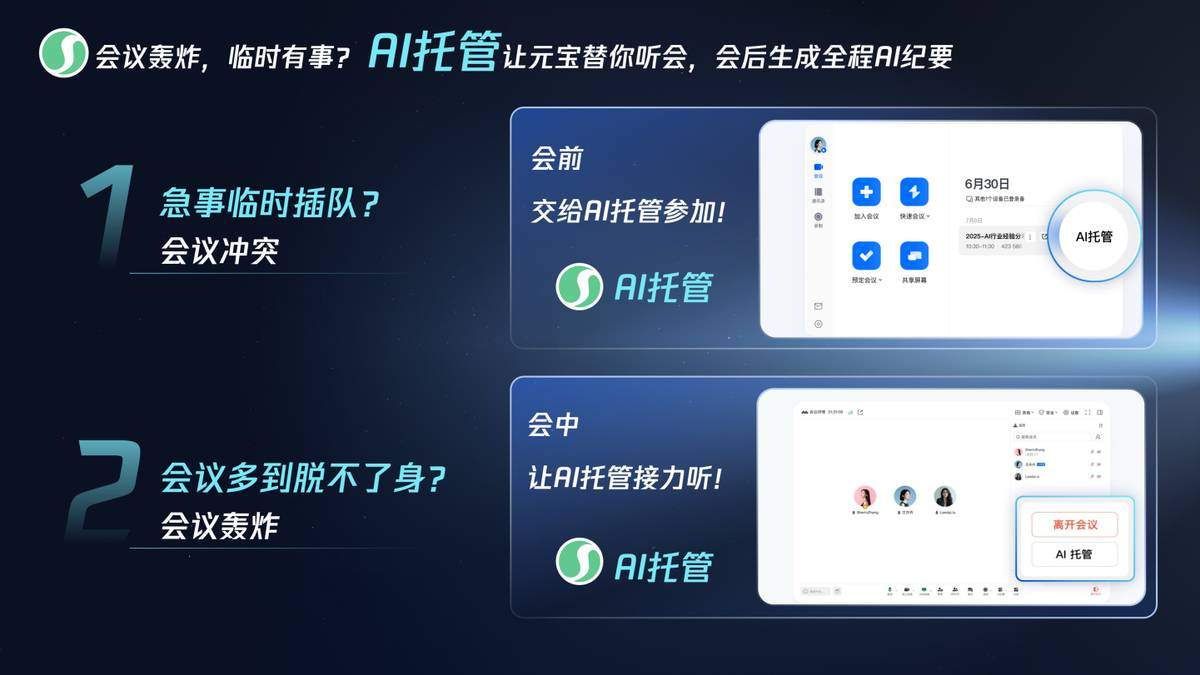 而AI托管功能的推出,则彻底颠覆了传统会议的参与模式。就像一个专属的“会议助理”,它能在用户分身乏术时,代为出席会议。无论是因堵车迟到、多个会议日程撞车,还是会中突发紧急事务需要离席,用户只需一键点击AI托管,元宝便会代为参会、完整记录,并在用户返回会议时,迅速提供此前错过的关键信息,实现无缝衔接。例如,当你在开会时突然接到客户电话,就可以将会议托管给元宝,处理完紧急事务后再无缝回到会议中,不会有信息断层。
