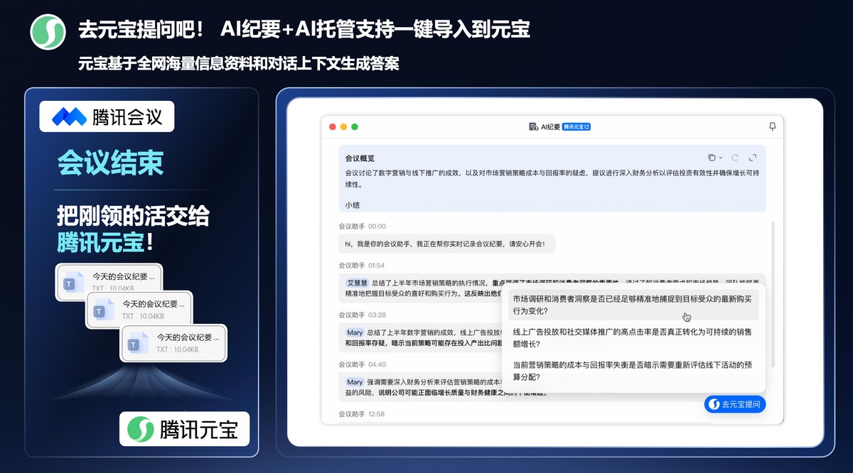 腾讯会议与元宝的深度融合,是此次AI功能升级的又一大亮点,真正让信息从腾讯会议无缝衔接至元宝中,将会议价值从会中延续至会后,持续服务人和业务。