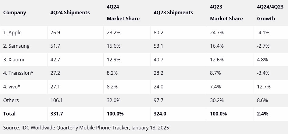 比如 IDC 数据就表示 2024 年第四季度,哪怕同比增长是负的,但苹果的智能手机销量依然大幅度反超三星,干到了全球第一。