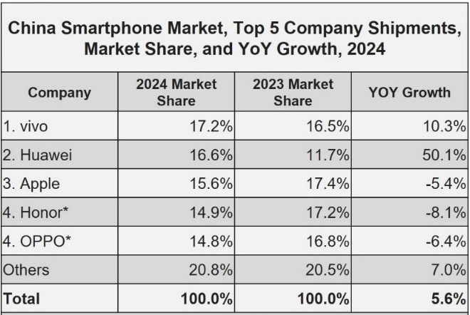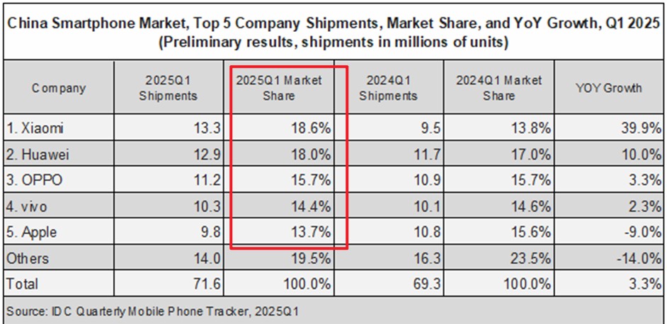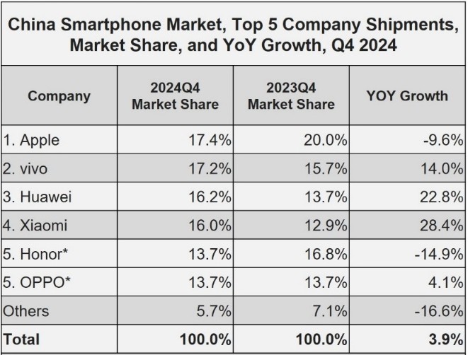 根据 IDC 数据显示,2024 年第四季度中国智能手机出货量第一虽然仍然是苹果,但同比却在下降,而且 vivo 、华为和小米紧紧咬在苹果身后,没有拉开太大差距。