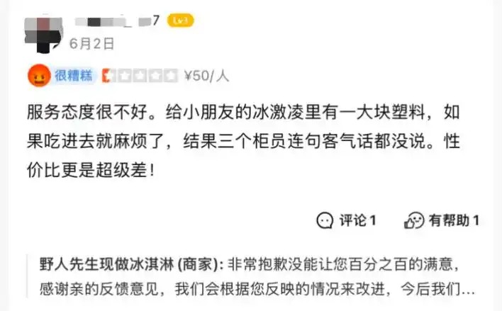 另外,野人先生部分门店曾被媒体曝光“外卖分量只有展示模型的一半,但价格没变”。即便是自取的订单,消费者也只能拿到提前冷冻起来的冰淇淋,与宣传的“新鲜”概念不符,当这名消费者提出疑问时,店员却态度强硬地表示“外卖就是这样的”。