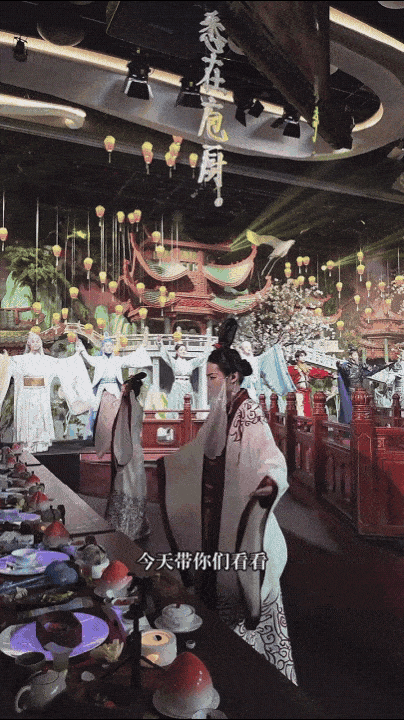 看图。走进这家“叙宴”餐厅,今天的主题是哪吒。换上汉服,你就不再是食客,而是赴宴的王公和贵人。从陈塘关到东海龙宫,吃每道菜前,都能看段表演。这一两个小时,表演比菜品重要,入戏比吃饭重要。