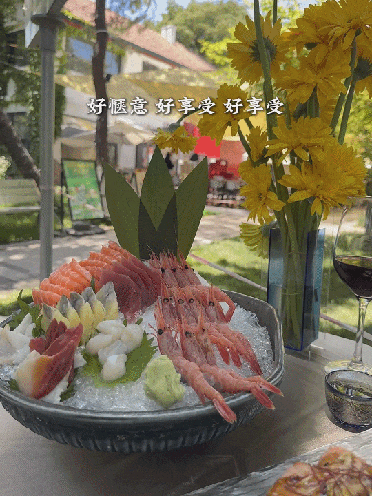 这是大渔·TAIRYO 18·花园自助餐厅。进门一拐,是一个开满鲜花的庭院。坐下,长舒一口气,人也像紧绷很久的弹簧,终于放松了下来。