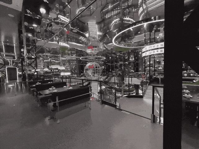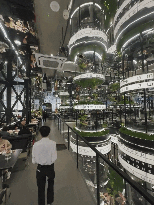 这里,是3号仓库·创意中国菜主题餐厅。银白色的金属,环形的灯带、层层叠叠的复杂结构,让人都有点分不清天花板和地板。