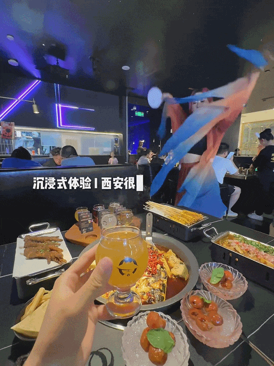 比如,一抬头,看到一道菜坐着“过山车”来到你面前;比如,推开庭院的门,听到微风吹过的沙沙声;又比如,身穿汉服的演员,在你面前舞起水袖。这些细节,单独拿出来可能不起眼,但叠在一起,就营造出一种特别的情绪场。让你放松,让你高兴,让你觉得“值”。