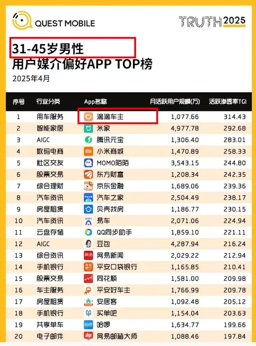 其实很多人也都明白,不是平台抽成高低的问题,而是现在开滴滴的人越来越多了。今年四月公布的31-45岁男性偏好APP榜单中,滴滴车主高居榜首。很多中年人失业以后,又找不到对口的工作,只能暂时开滴滴补贴家用。