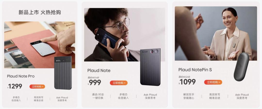 △从左到右:Plaud Note Pro、Plaud NotePin S、Plaud Note。图源:企业官方