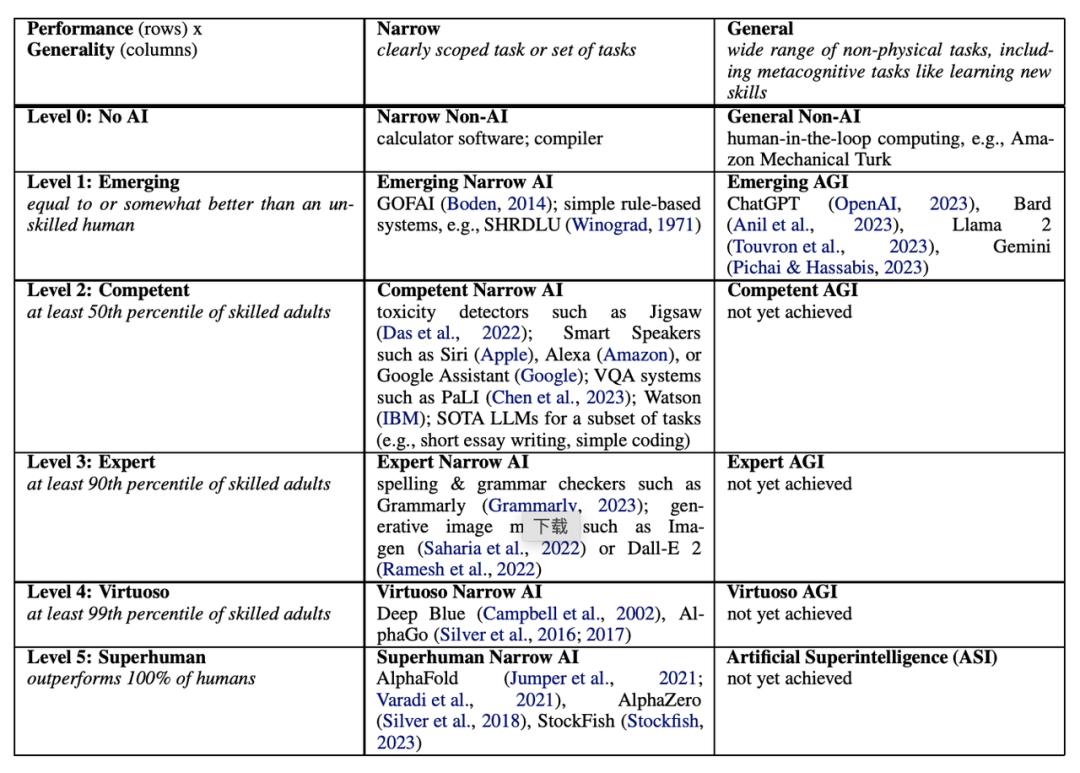 今天阿里提出的ASI并不是一个新名词。今年3月,Google DeepMind披露了“AGI六级路线图”,这和阿里的ASI三部曲有颇多对应之处:ASI的第三阶段“超越人类”,就和DeepMind所定义的AGI Level 6颇为相像。