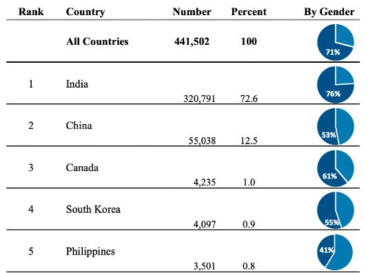 过去五年中,每年都是印度人拿下了绝大部分的H-1B签证,占比达到了70%以上,其次才是中国人、加拿大人、韩国人。印度的理工科教育体系,其实还算不错,能够培养大量的高素质人才,尤其是IT领域的,而印度本土的经济发展相对滞后,实际上缺乏就业空间,走H-1B签去美国赚钱就成了为数不多的选择。很多人都不知道,印度为全球接收侨民汇款最多的国家,大批印度人在外面打工赚钱然后寄回家里,每年产生1250亿美元的收入,其中就有1/4来自美国,堪称咖喱味的印钞机。
