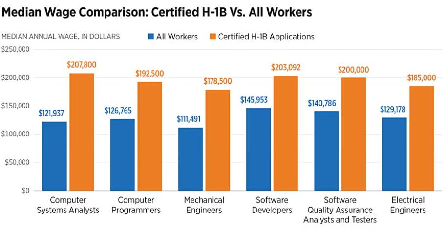 而工作机会就代表着收入和话语权,他们希望特朗普不仅仅是通过驱逐非法移民来腾出洗碗工、擦车工之类的低端岗位,也要把程序员、工程师这样薪资相对高的技术岗,留给美国人自己,执行不彻底等于彻底不执行。我们前面提到过,全美H-1B人才的平均年薪是大约16.7万美元,这一数字,已经是美国人均收入的2倍有余,妥妥的高收入群体,非常吸引仇恨,自然成了红脖子的集火目标。
