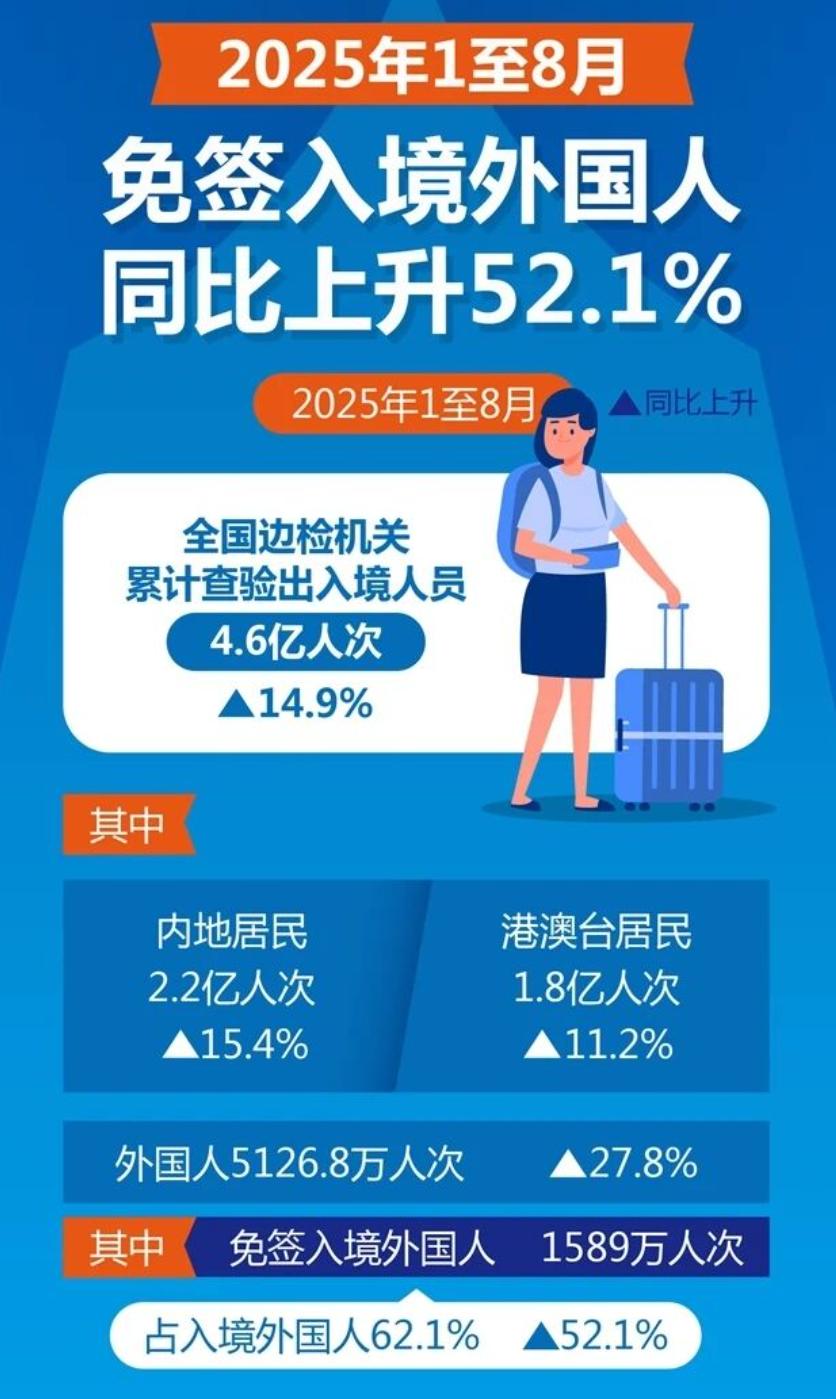 旅界此前曾报道,今年上半年1-6月,2000万人次外国人涌入中国,而据国家移民管理局最新数据,1-8月,外国人来华人次已经升至2500万,中国文旅市场红利正在逐步显现。