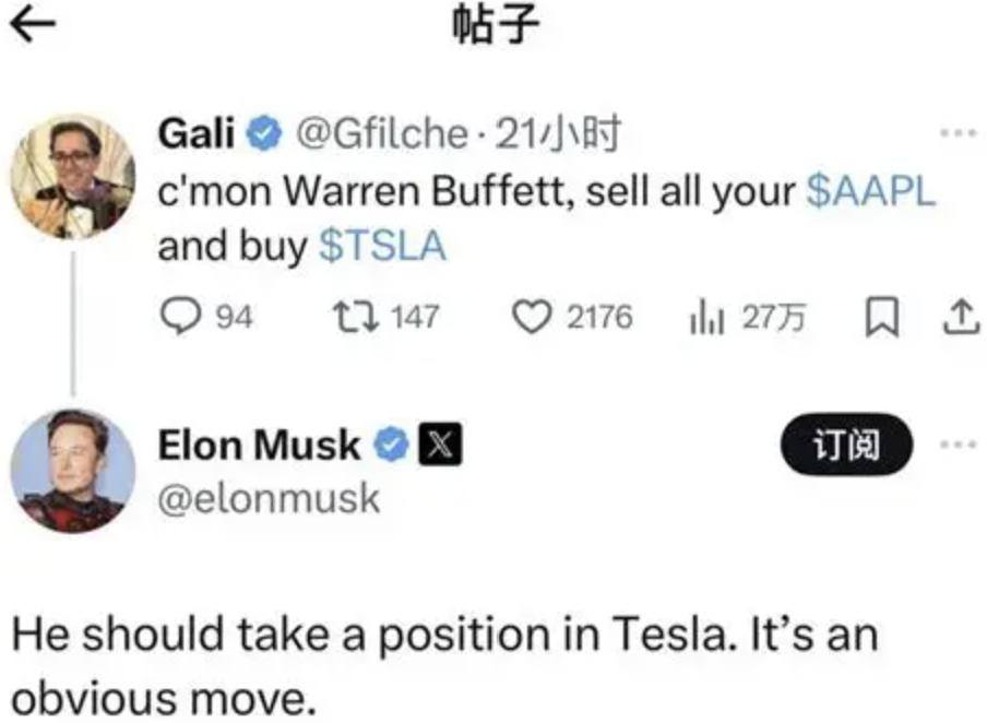 马斯克对于巴菲特没有投资特斯拉这件事,也有点耿耿于怀的意思。2023年时马斯克曾在社交媒体上公开表示,2008年特斯拉估值仅2亿美元,但巴菲特的合伙人芒格回绝了这个历史性的投资机会。