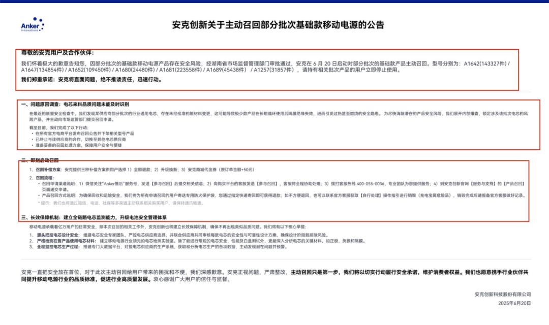 而在国内方面,今年6月,安克创新同样因部分批次基础款移动电源存在安全风险,宣布主动召回约71.3万个充电宝产品。
