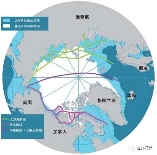 北极航线示意图,图中北方海航道即为东北航线 图片来源:《世界海运》