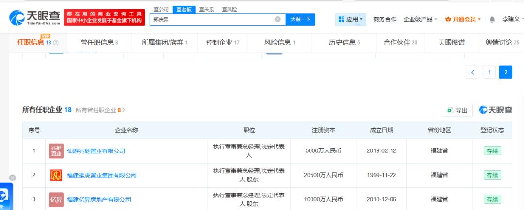 天眼查显示,郑庆昇出生于1956年,中国国籍,无境外永久居留权。在福建亿昇房地产有限公司、福建挺虎置业集团有限公司、上海阿斯顿马丁汽车销售有限公司等17家存续企业中任职。