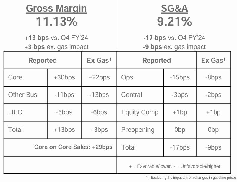 据公司披露,绝大部分的毛利走高(10bps)是来自油气价格的下降。除此之外,公司核心零售业务毛利的提高,被附加业务毛利的下滑和后进先出(LIFO)规则下成本的上升的影响抵消后,贡献了剩下3bps的零售毛利率上升。