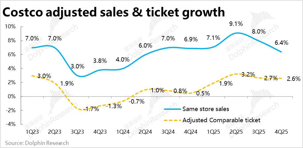 1、名义同店增长看似平稳,但客流已明显走弱:最关键的经营指标,Costco本季度整体同店销售增速为5.7%,相比上季持平,看起来依旧平稳。但同店客流量的增长已明显下滑到仅3.7%,是近3年来的最低水平。