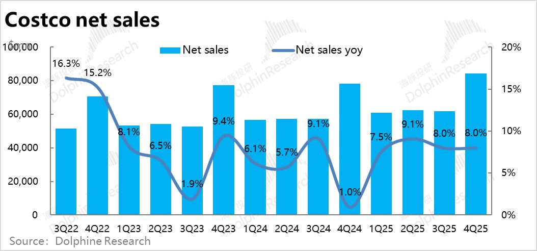 4、整体上,如上文所述,虽然更“真实”的同店销售在走弱,但名义上的同店增长依然平稳。并且本季度内新增了9家门店,开店节奏依旧较快,对收入增长有拉动作用,因此本季度Costco整体商品销售收入仍同比增长了8%,和上季持平。