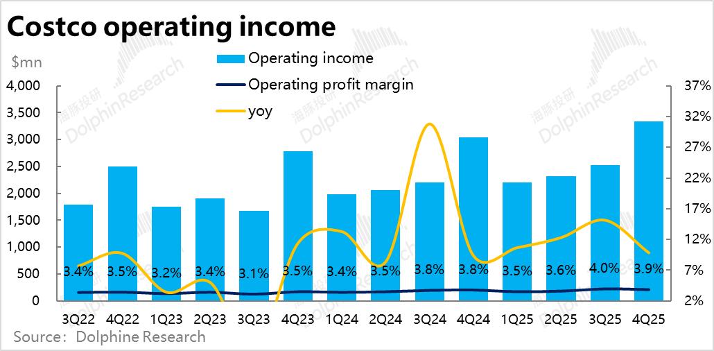 8、费用扩张拖累利润增长:由于费用率同比扩张的幅度高于销售毛利率扩张幅度,导致零售业务的利润率收窄(因会费收入的增长,公司整体的经营利润率还是走高的)。因此,本季公司的经营利润为33.4亿,小幅跑输预期的33.8亿。同比增速也跌至个位数的9.8%,继续向收入增速靠拢。利润表现无疑并不好。