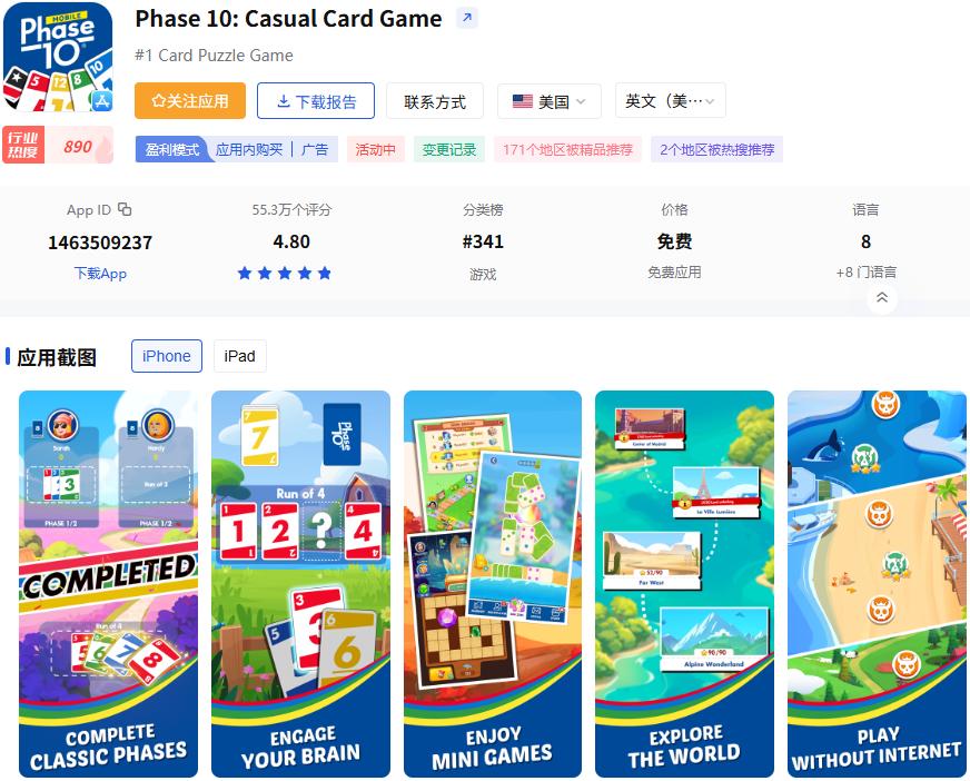 先是2019年10月上线的《Phase 10: Casual Card Game》,其原型源于经典的纸牌游戏“Phase 10”,玩法相对重度,单局长度在10分钟左右(上线初期单局时长为45分钟至1小时,后做了碎片化处理)。