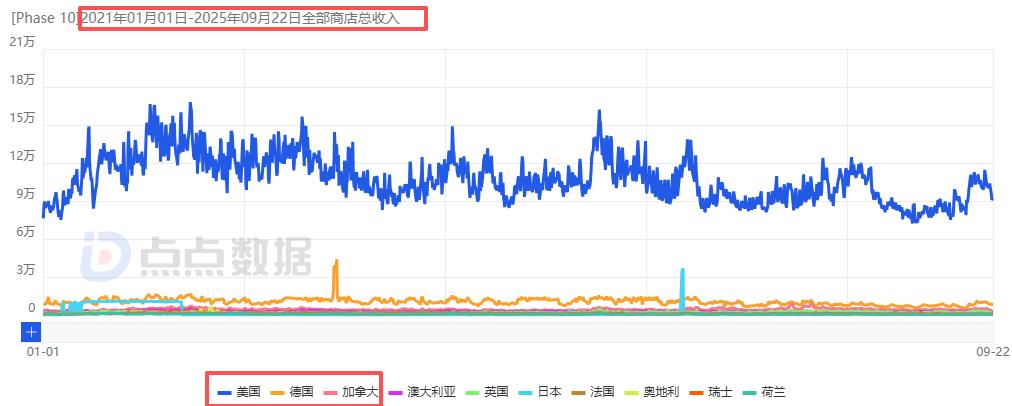 2021年至今其累计流水约为17亿元,为美泰旗下所有产品收入TOP1,其中美国、德国、加拿大以77.52%、7.57%、3.15%的占比位列TOP3,就趋势而言在波动中略有下滑(2021年年流水为4.15亿元,2024年为3.31亿元),当前月流水在2000万至3000万之间浮动。