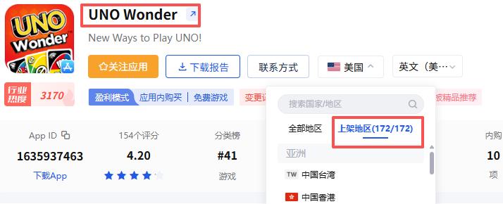 就在9月17日,美泰163正式在全球170多个国家及地区上线了第二款UNO游戏——《UNO Wonder》,当天便登上35个区域市场iOS游戏免费榜TOP20(其中位于美国第2、德国第6、丹麦第7),预计可能成为新的长线爆款。