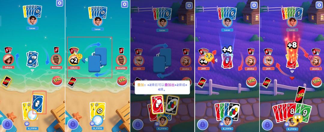 紧接着,我们将视线转回游戏本身,玩法上《UNO Wonder》依然在“UNO”玩法的框架里,单局时长在3分钟左右。
