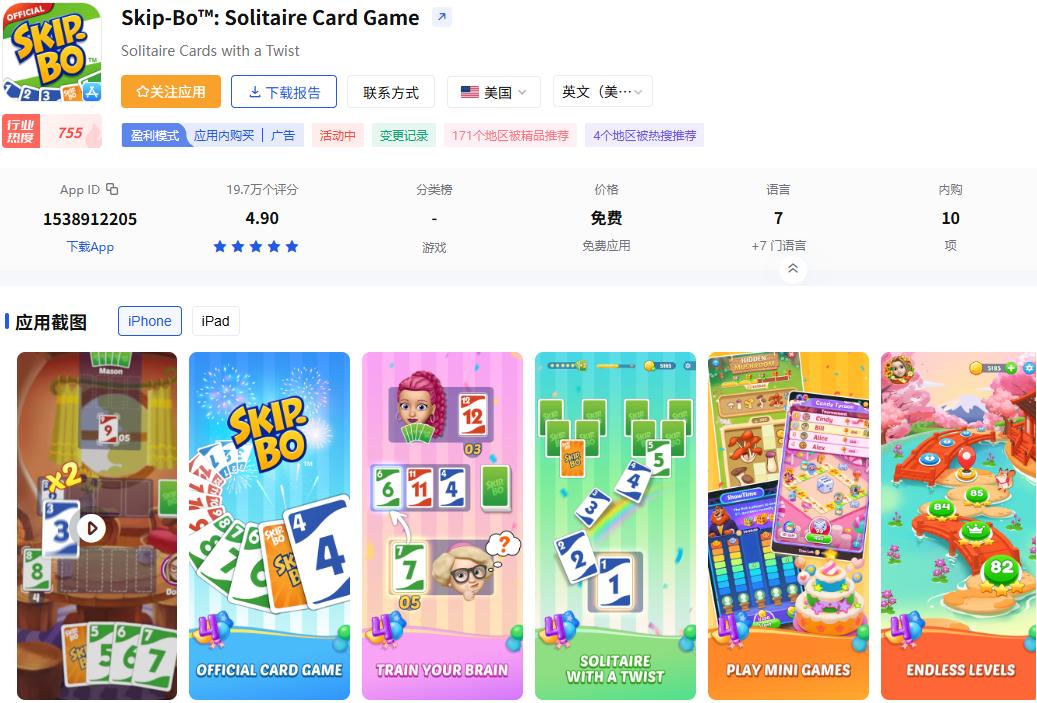 其次是2021年10月上线的《Skip-Bo™: Solitaire Card Game》,截至目前总流水预估在4.03亿元,其中美国、德国、加拿大占比52.98%、12.87%、6.11%位列TOP3,整体表现不如《UNO!™》以及《Phase 10》。就趋势而言,在2023年达到峰值后(2023年年流水为1.39亿元),也处于缓速下滑中(2024年年流水为1.18亿元),当前月流水在650万左右。