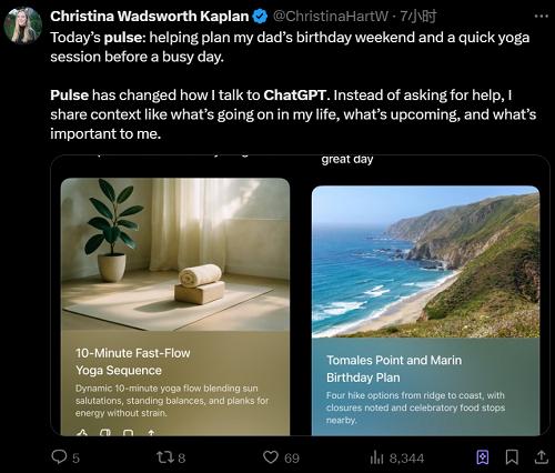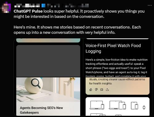 还有网友分享,Pulse可根据对话主动展示她可能感兴趣的内容,点击每张卡片后都会打开一个新的对话,其中包含非常有用的信息。