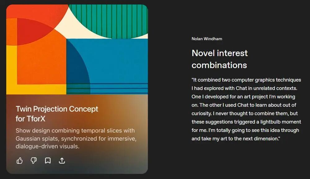 还有用户体验到了Pulse的“兴趣组合”能力。他回忆道:“它把我和它在不同对话里探讨过的两种计算机图形学技术结合了起来。一种是我艺术项目里用到的,另一种是我出于好奇学的。我从没想过要把这两者结合,但它的建议让我灵光一闪。我打算把这个想法实践出来,让我的艺术作品迈向一个新的维度。”