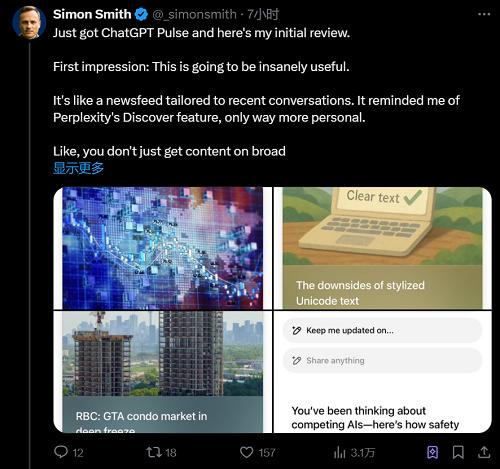 医疗技术公司Klick Health的生成式AI执行副总裁Simon Smith发文称,Pulse和AI搜索引擎Perplexity的“发现”功能十分类似,但更加个性化,甚至可以为用户随口一问的问题,找到对应的深度文章,提供更为全面的见解。