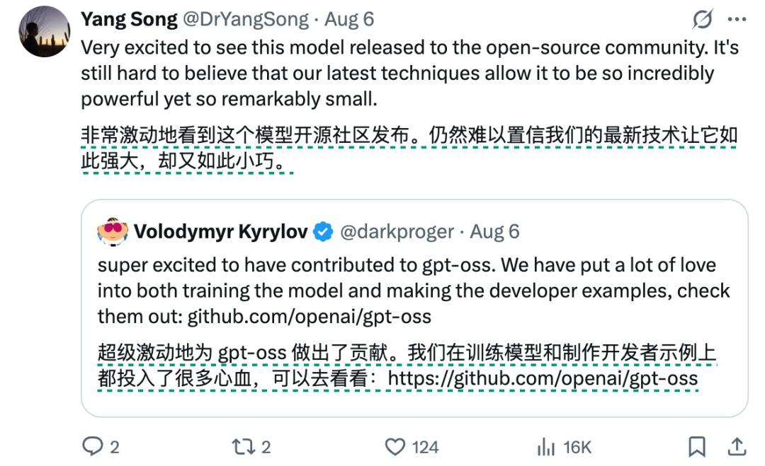 翻看他本人在𝕏上的最新一篇推文,还是上个月因GPT-OSS而激动。