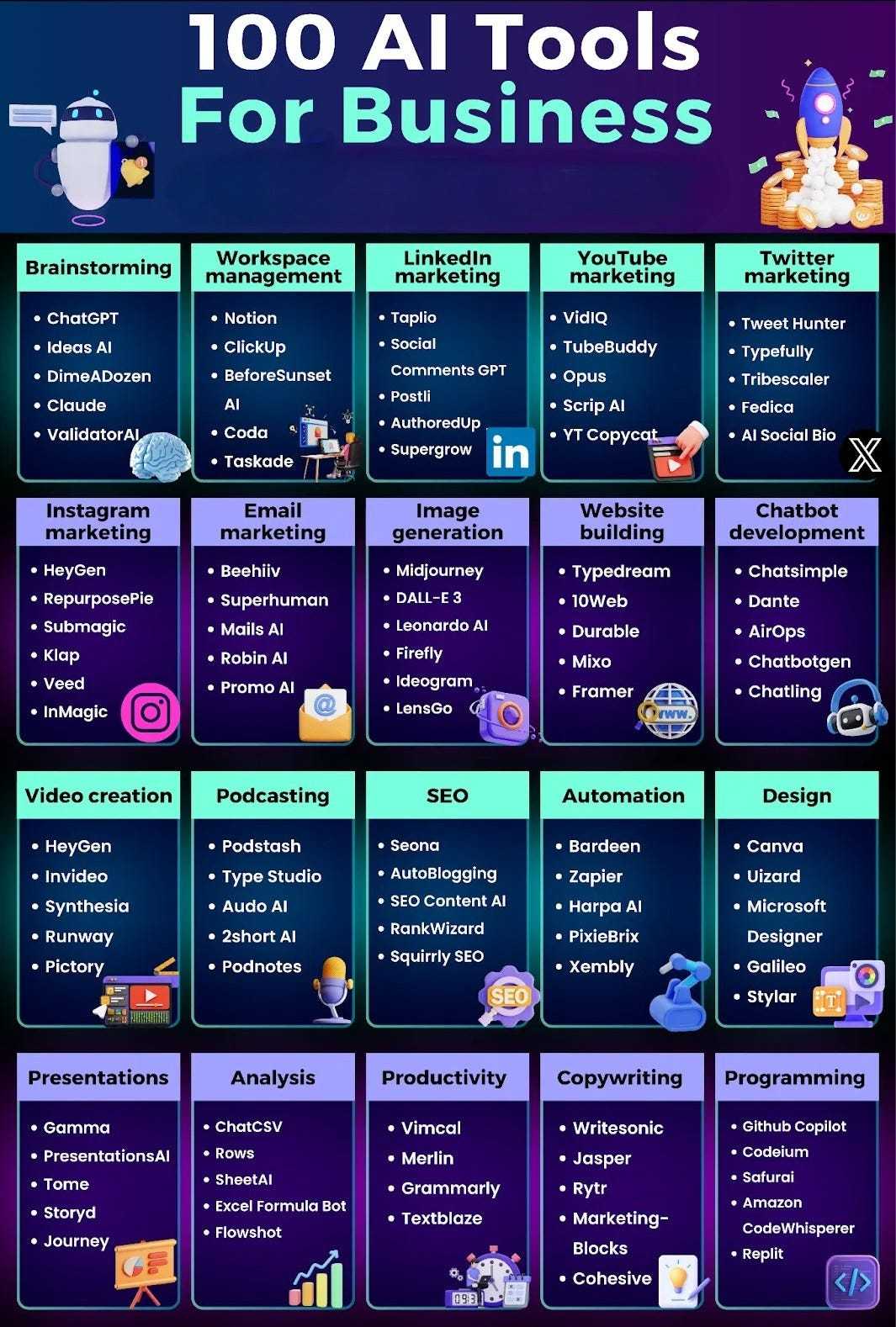 一份包含100种商业AI工具的汇总,涵盖头脑风暴、市场营销、自动化、SEO、生产力、播客、设计等领域,帮助专业人士利用AI简化工作流程并扩展运营。